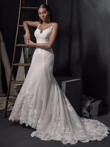 Boho meets maximalist bride in this flattering slim Aline gown. Lace appliques float over a layer of beaded and sequined tulle.
